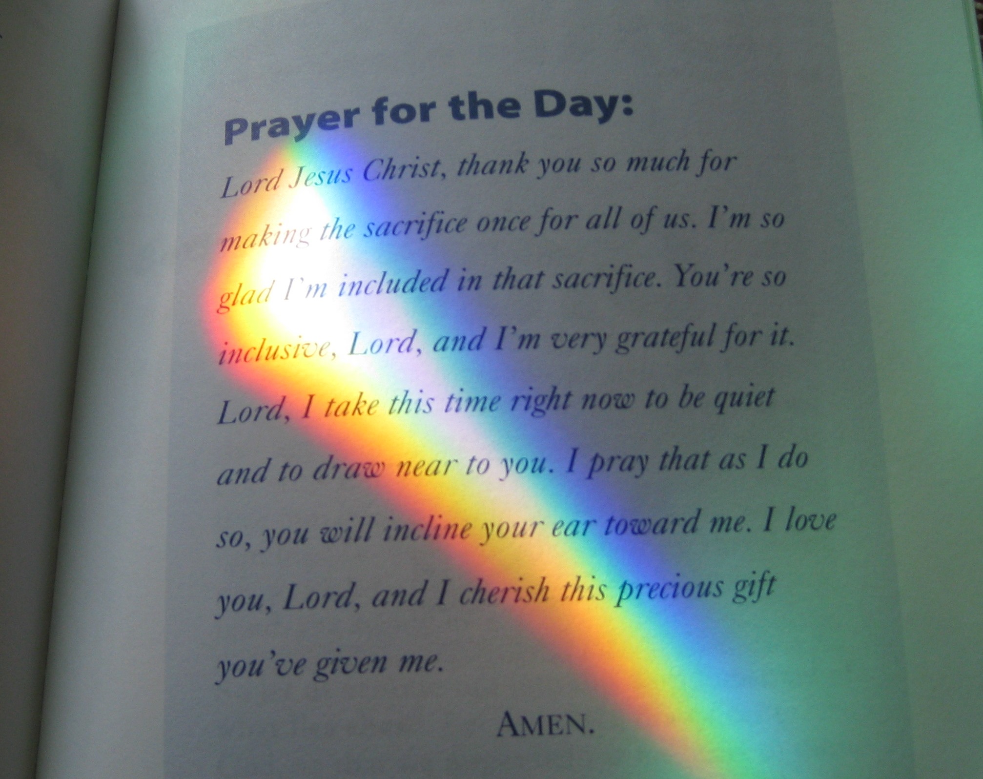 One morning as I read my devotional book, a rainbow spread across the page. As if God highlighted it with His multi-colored light. It came from the crystal I placed near my window. Often it splashed a kaleidoscope of colors in my kitchen each morning. On the walls, on the floor, on the counter…Never before did it light up the page of my book.